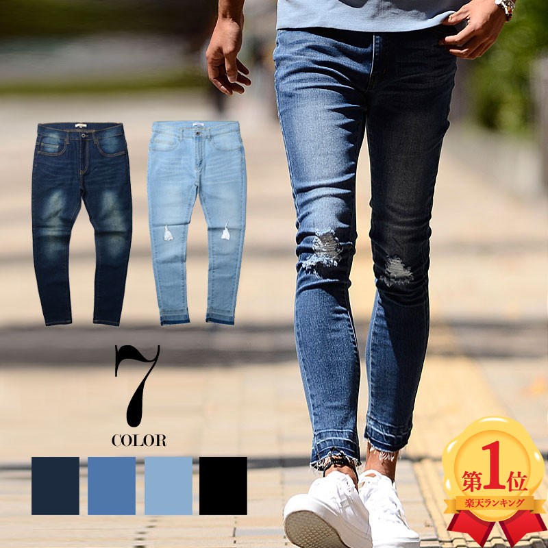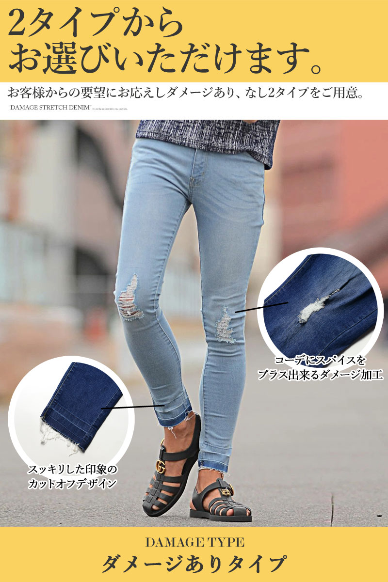 [モデルサイズ]身長:178cm体重:65kg M着用/身長:182cm体重:68kg L着用 ◆カラー◆ 【ダメージ無し】ブルー/インディゴ/サックス/ブラック【ダメージ有り】ブルー/インディゴ/サックス ◆素材◆ 綿80% ポリエステル19% ポリウレタン1%(ダメージ有り綿80% ポリエステル18% ポリウレタン2%) (関連カテゴリー;メンズカジュアル、ビター系ファッション、紳士ズボン、男性用ジーンズ、男性ジーパン men'sファッション、メンズスキニーデニム、メンズデニムパンツ)◆商品詳細◆ 2020年9月23日、ダメージ無しタイプ追加!ダメージありタイプとダメージなしタイプの2パターンから選択可能♪
